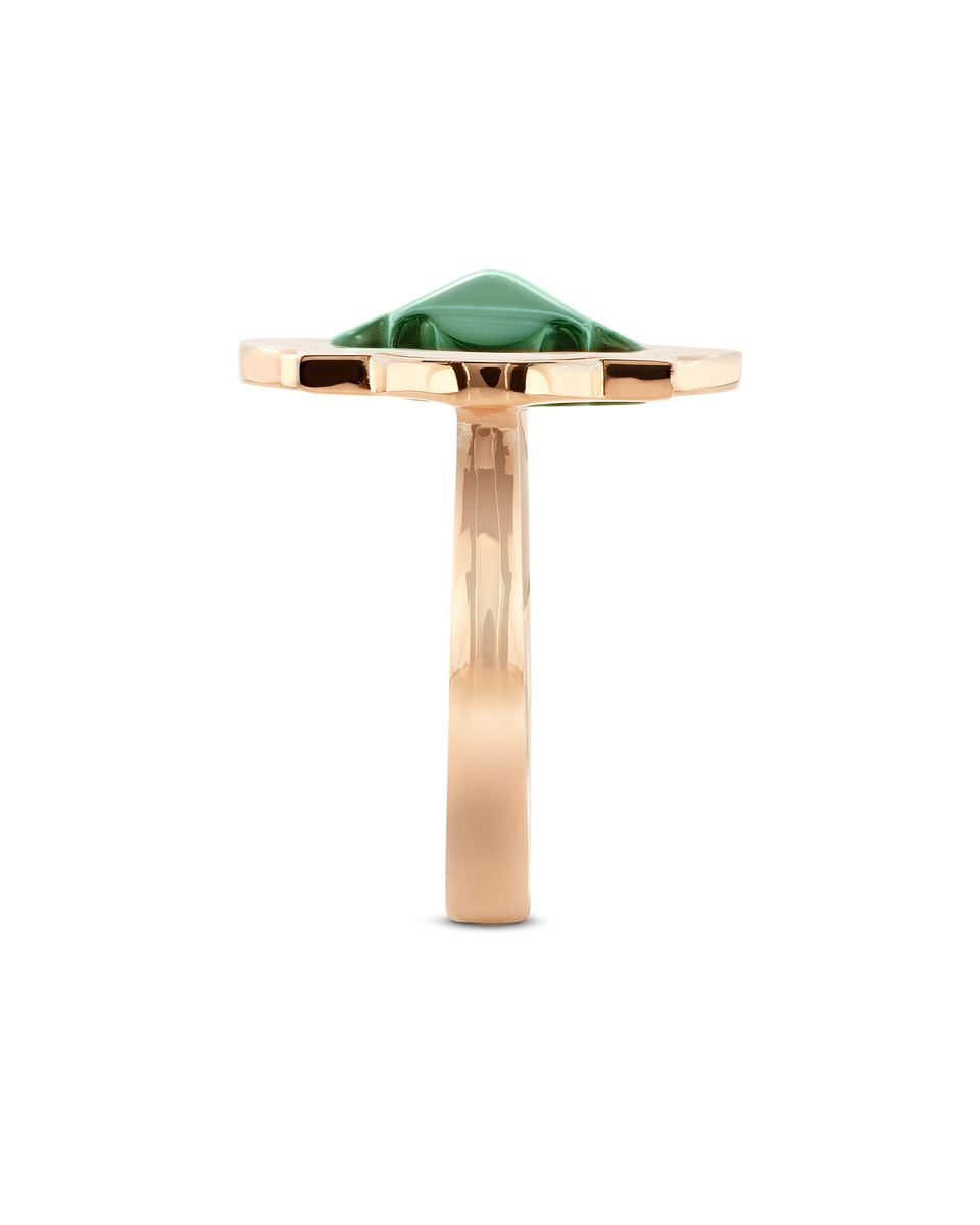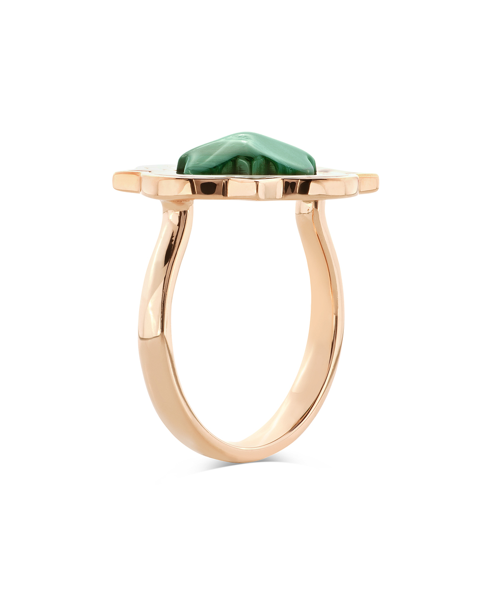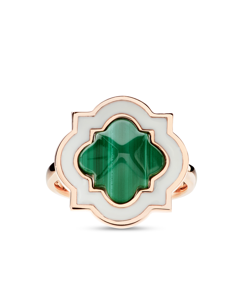 This ring with an iconic design is characterized by a bold aesthetic that combines materials, colors and essential lines. The geometric lines reveal a fluid and sinuous line and are animated by the intense light of the white enamel and embellished with a malachite with pyramidal cut