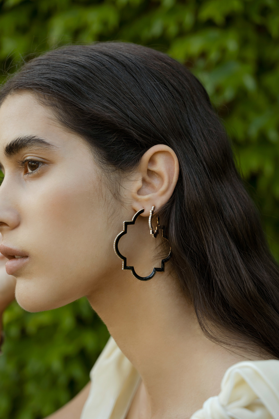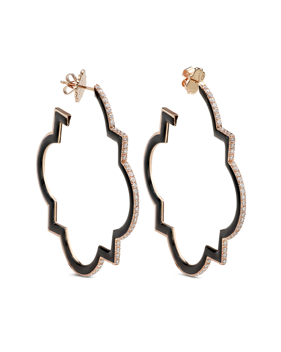 Leonori renews the charm of the hoop earrings, here in the big version, covering them with precious black enamel and diamonds. A visionary style, with a unique design.