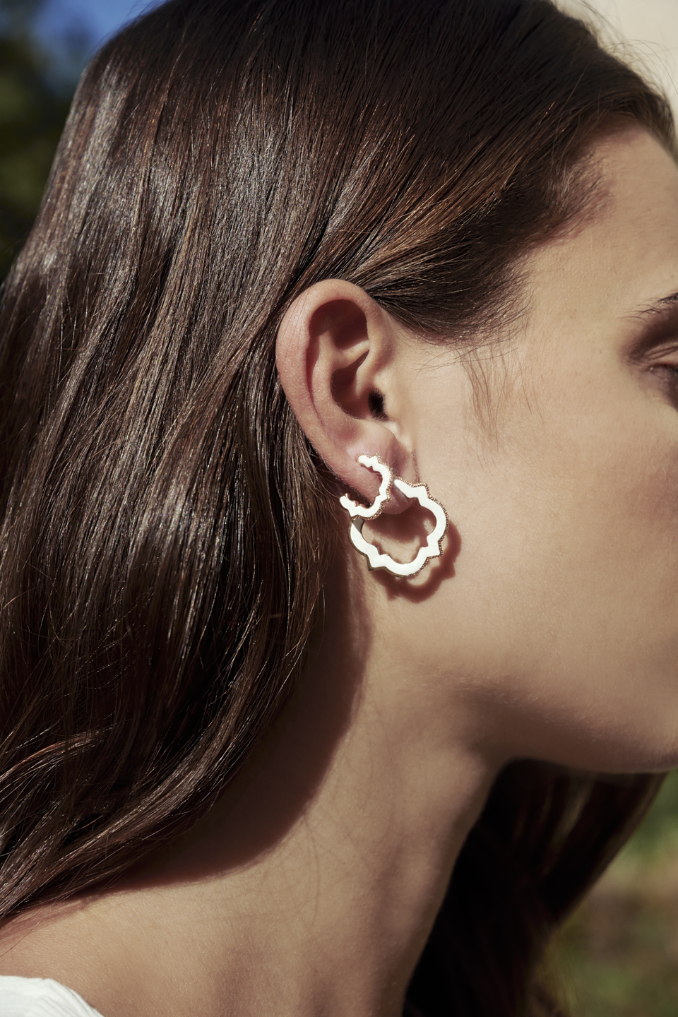 Leonori renews the charm of the hoop earrings, here in the mini version, covering them with precious white enamel and diamonds. A visionary style, with a unique design.