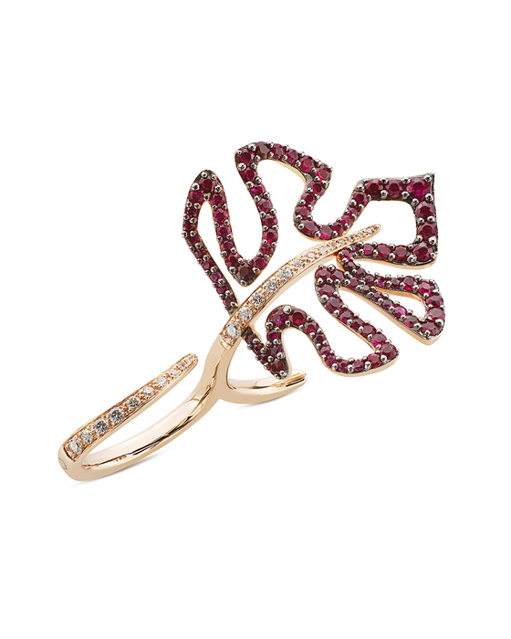 The rubies are highlighted by a trail of diamonds which cover the stem of the design, donating movement and sinuosity to these elegant earrings