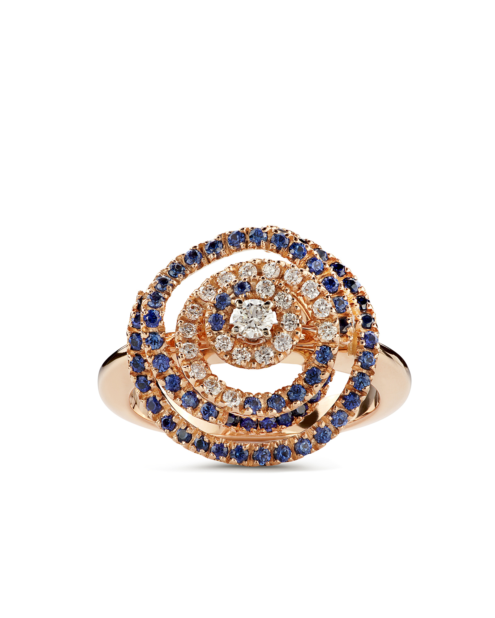 ANELLO PEONIA, ORO ROSA, DIAMANTI E ZAFFIRI BLU