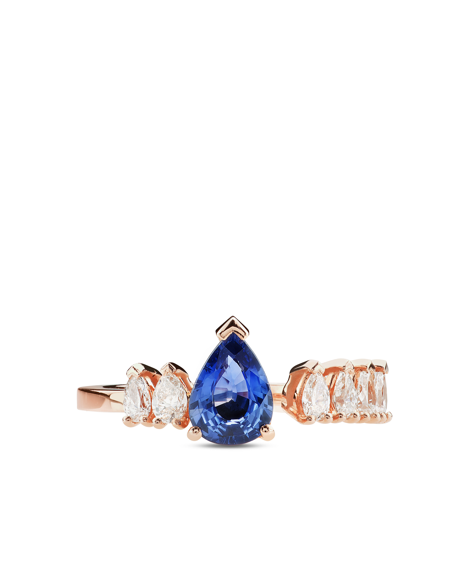 ANELLO GOCCIA, ORO ROSA, DIAMANTI E ZAFFIRO BLU