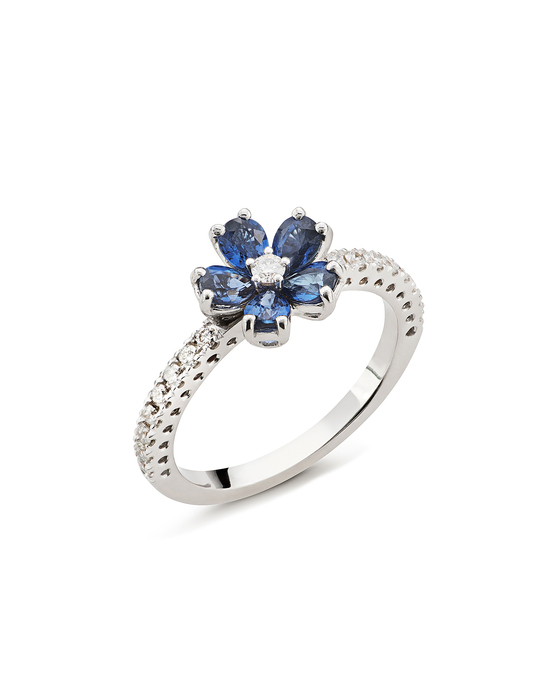 ANELLO FIORE DI CILIEGIO, ORO BIANCO, DIAMANTI E ZAFFIRI BLU