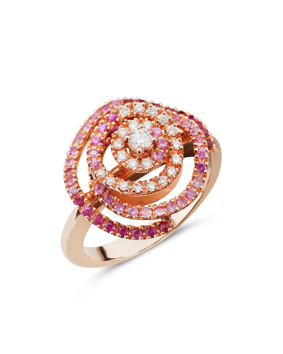 ANELLO PEONIA, ORO ROSA, DIAMANTI, ZAFFIRI ROSA E RUBINI