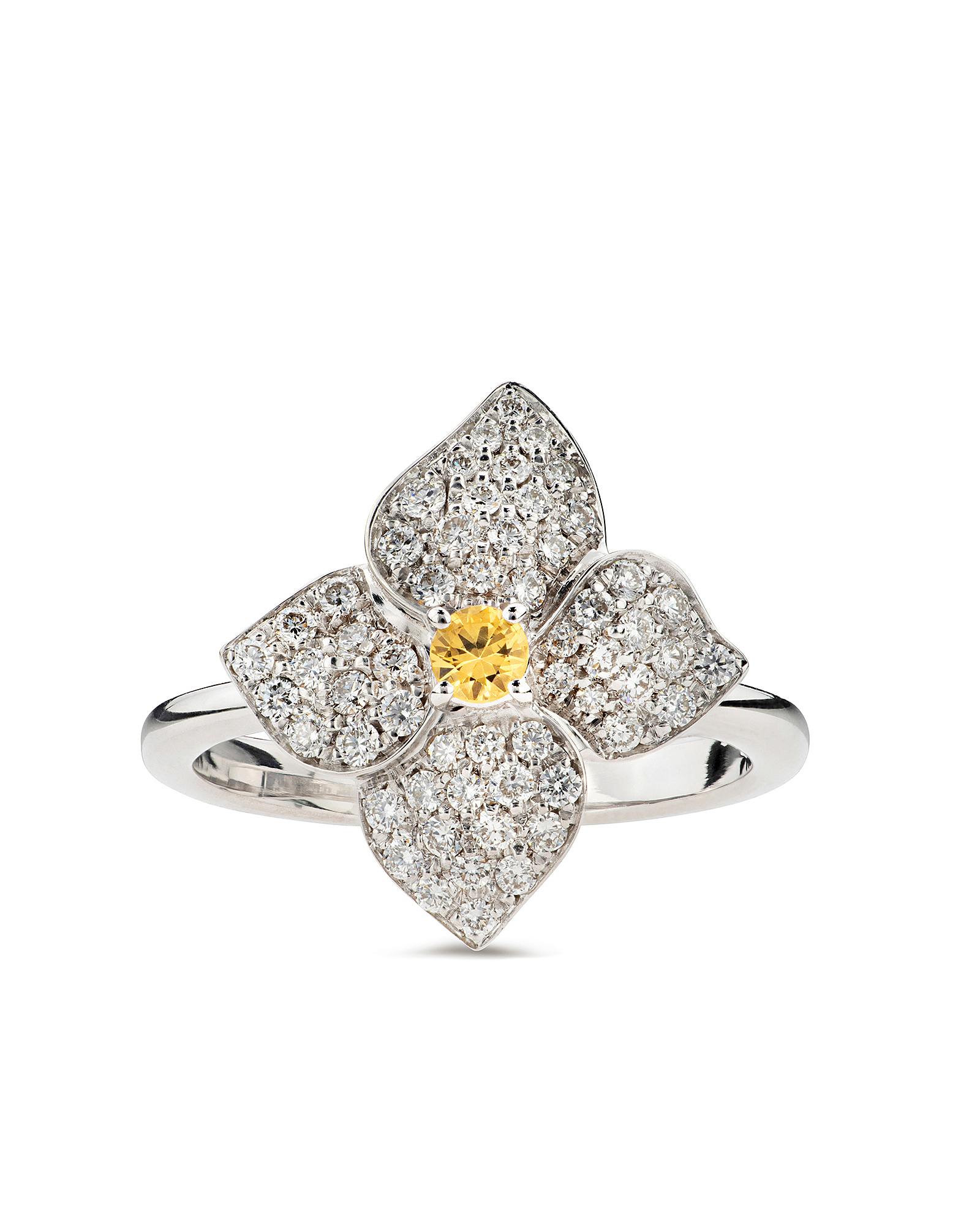 ANELLO ORTENSIA FIORE, ORO BIANCO, DIAMANTI E ZAFFIRO GIALLO