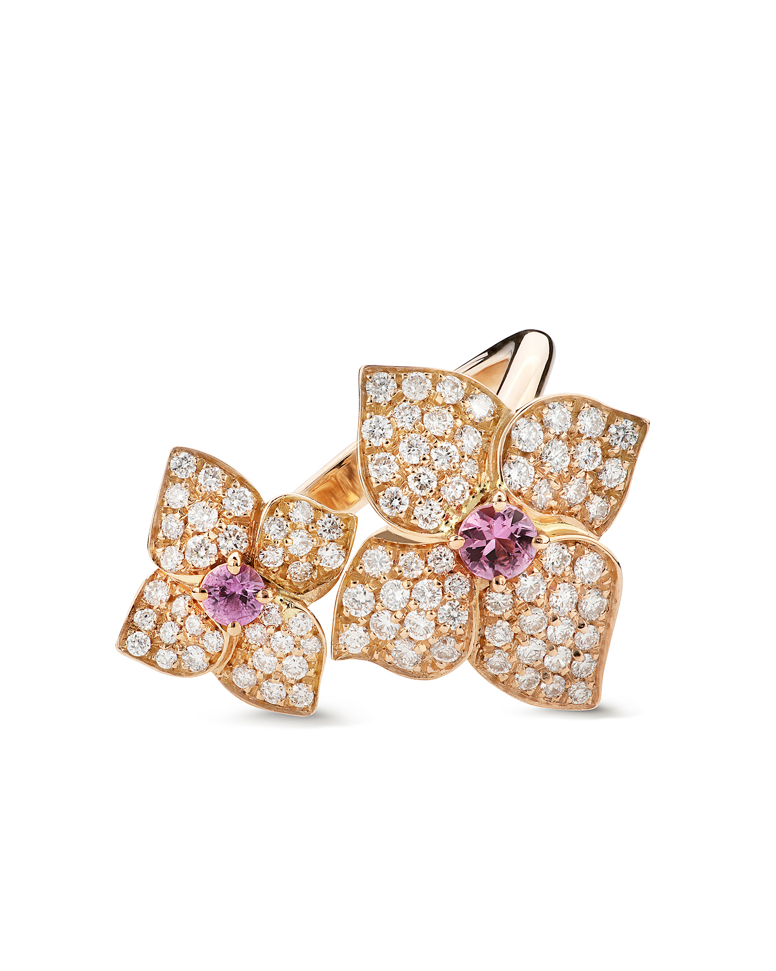 ANELLO ORTENSIA DOPPIO FIORE, ORO ROSA, DIAMANTI E ZAFFIRO ROSA