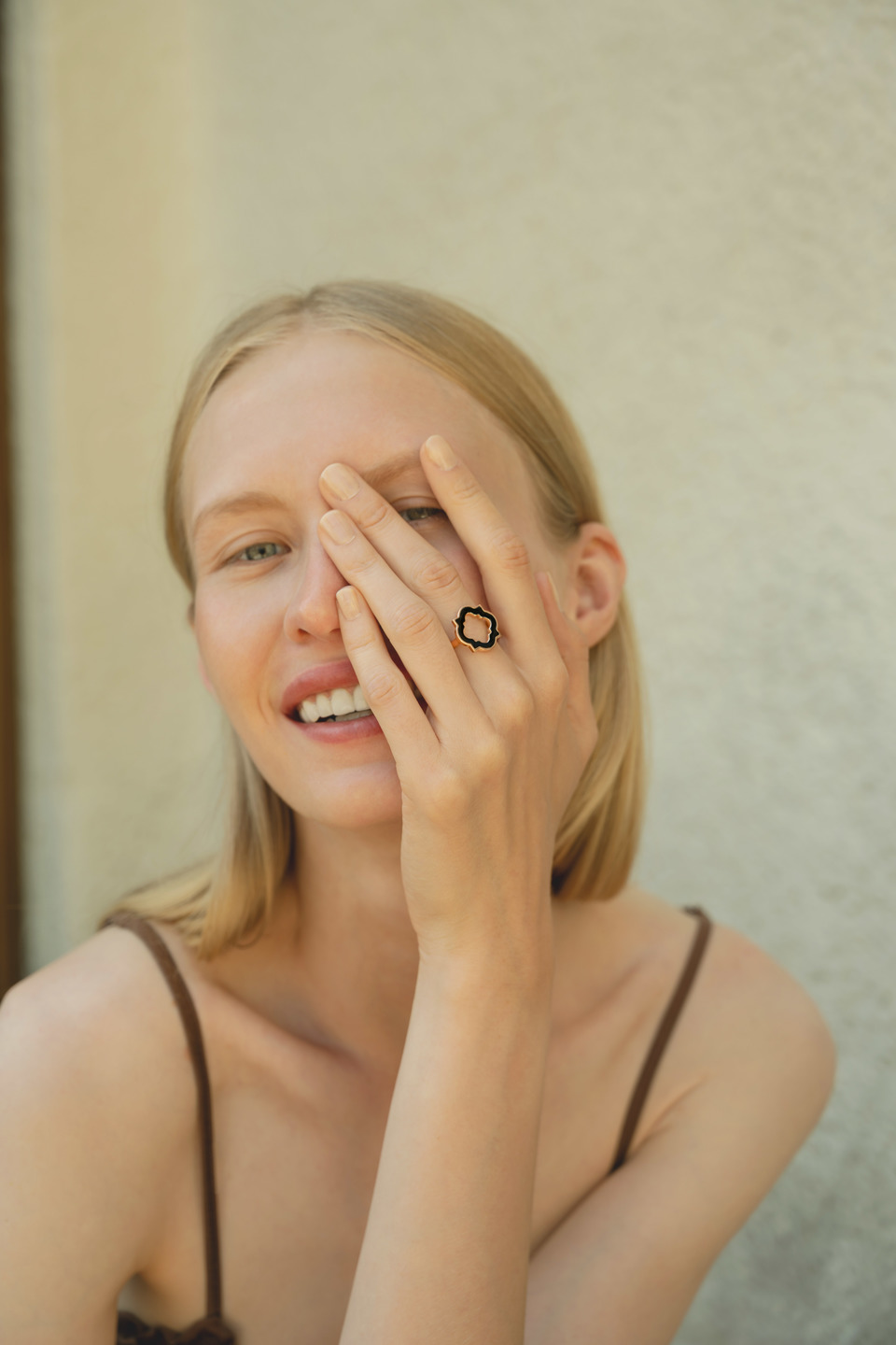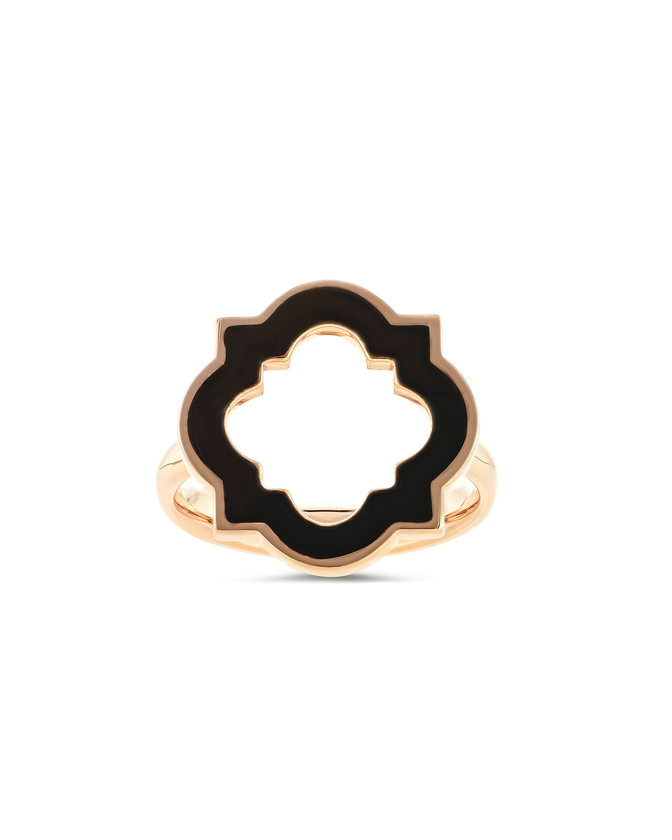Un anello dal design iconico caratterizzato da un'estetica audace che unisce materie, colori e linee essenziali. Le linee geometriche svelano un tratto fluido e sinuoso animate dalla luce intensa della smaltatura nera.