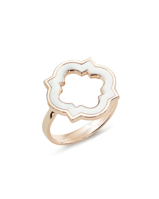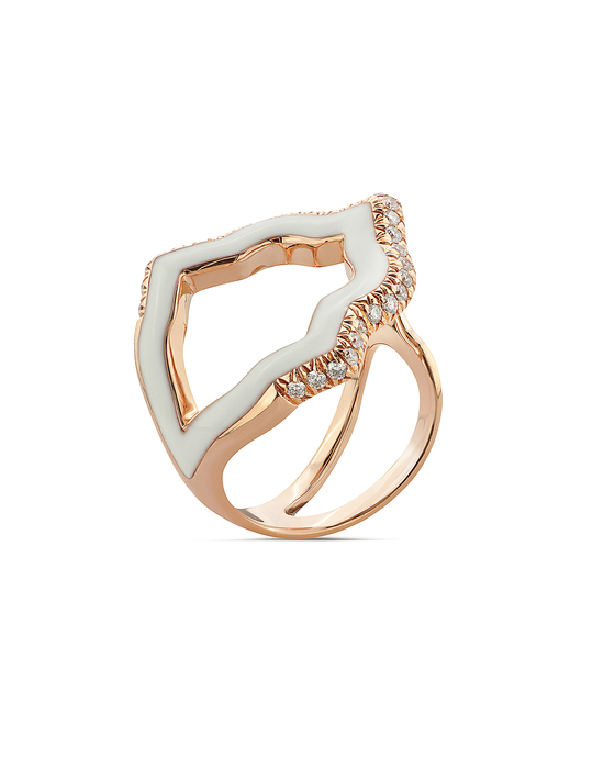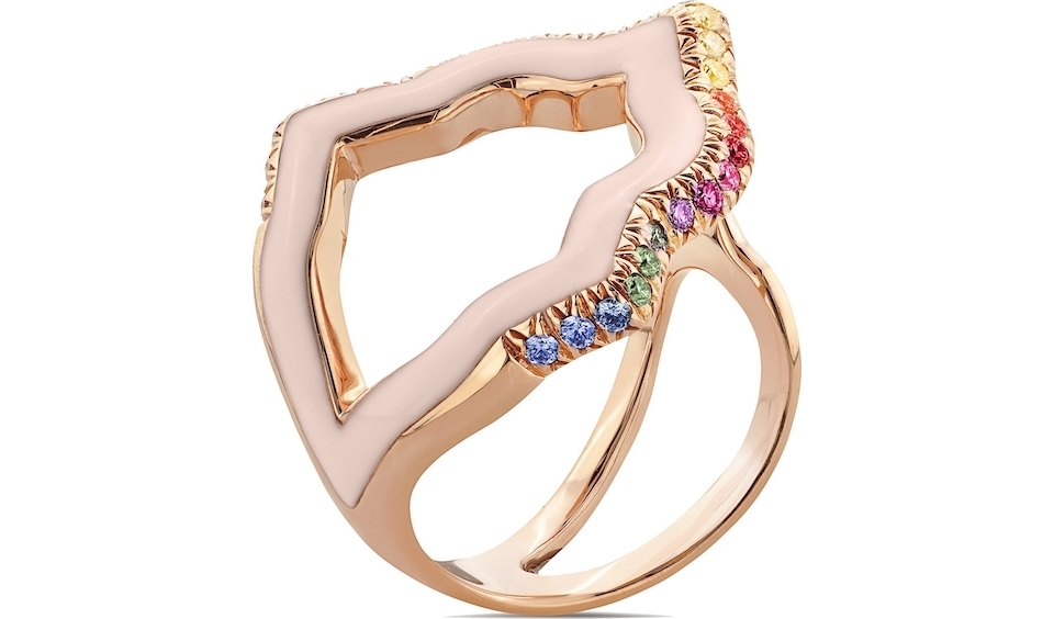 L'anello è in oro rosa 18 carati, con smaltatura rosa cipria e un profilo di zaffiri multicolore a rappresentare i colori dell’arcobaleno simbolo di pace nel mondo.