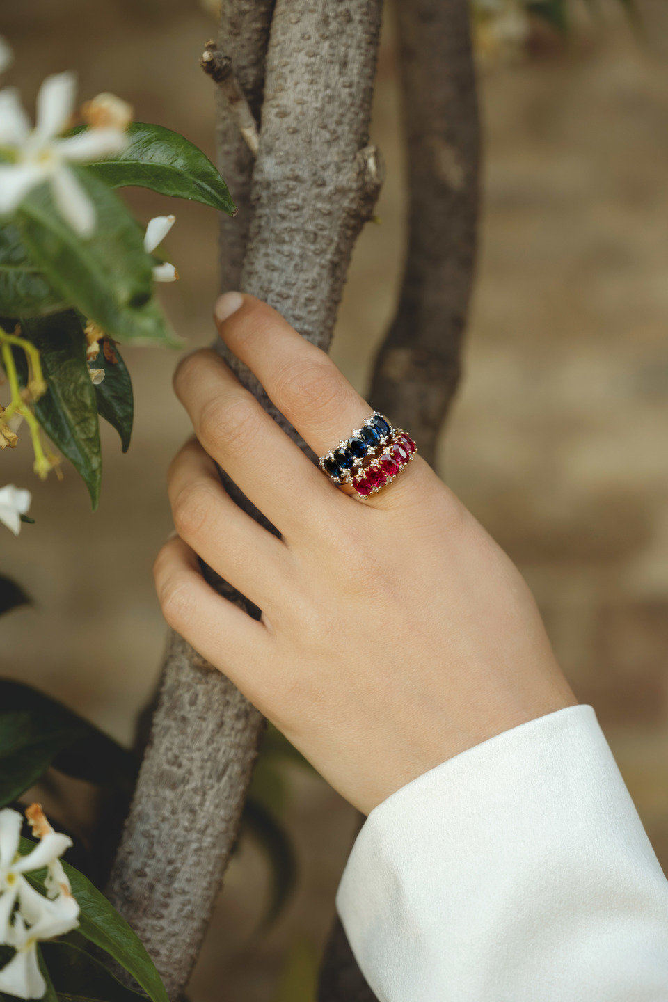 Un elegante anello, con composizione di rubini incorniciati da diamanti, capace di esprimere calore e lucentezza per una bellezza senza tempo.