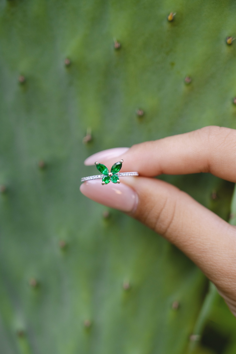 Questo gioiello realizzato in oro bianco appartiene alla collezione Butterfly. I diamanti impreziosiscono l'anello e illuminano la farfalla centrale in smeraldo che si rivela in tutta la sua romantica lucentezza.