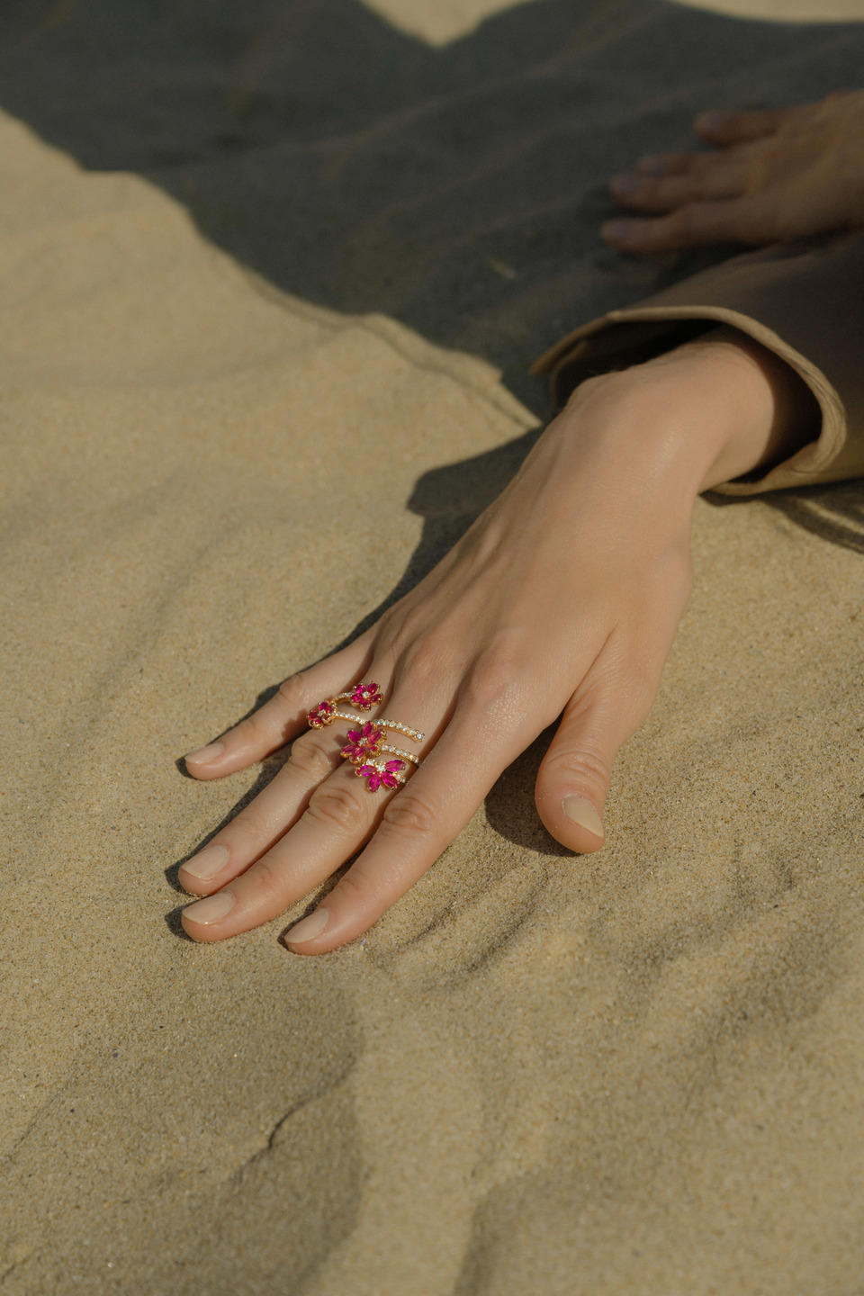 ANELLO DOPPIO FIORE, ORO ROSA, DIAMANTI E RUBINI