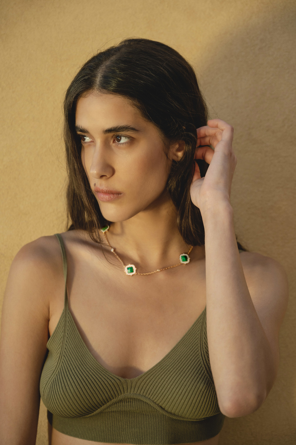 Questa collana è un inno alla femminilità pura, presenta un’attitude profondamente elegante e un design caratterizzato da un'estetica audace. Realizzata in oro rosa 18 carati, malachite e diamanti, è un raffinato omaggio all'iconico simbolo della Maison. La preziosa catenella è composta da sette simboli di malachite intagliati a mano, decorati dalla smaltatura e impreziositi dai diamanti. Il versatile gioiello aggiunge un dettaglio elegante e luminoso a qualsiasi outfit.