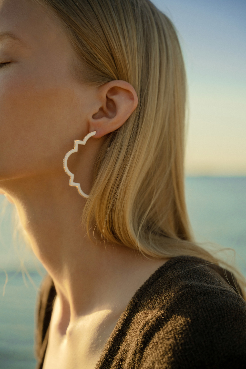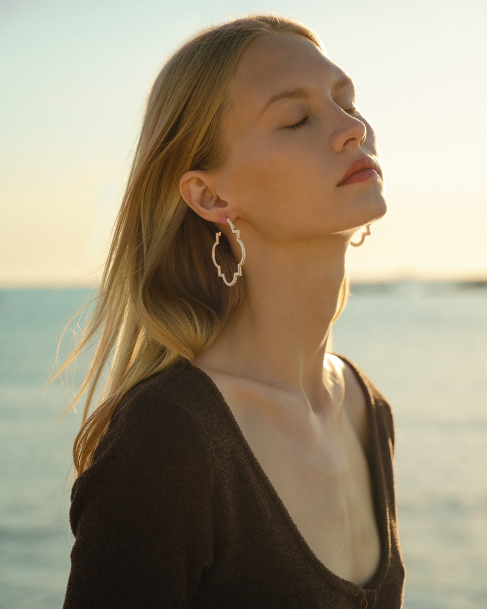 Leonori rinnova il fascino degli orecchini a cerchio, qui nella versione grande, rivestendoli di preziosa smaltatura bianca e diamanti. Un design caratterizzato da un'estetica audace e inaspettata che combina materiali, colori e linee essenziali.