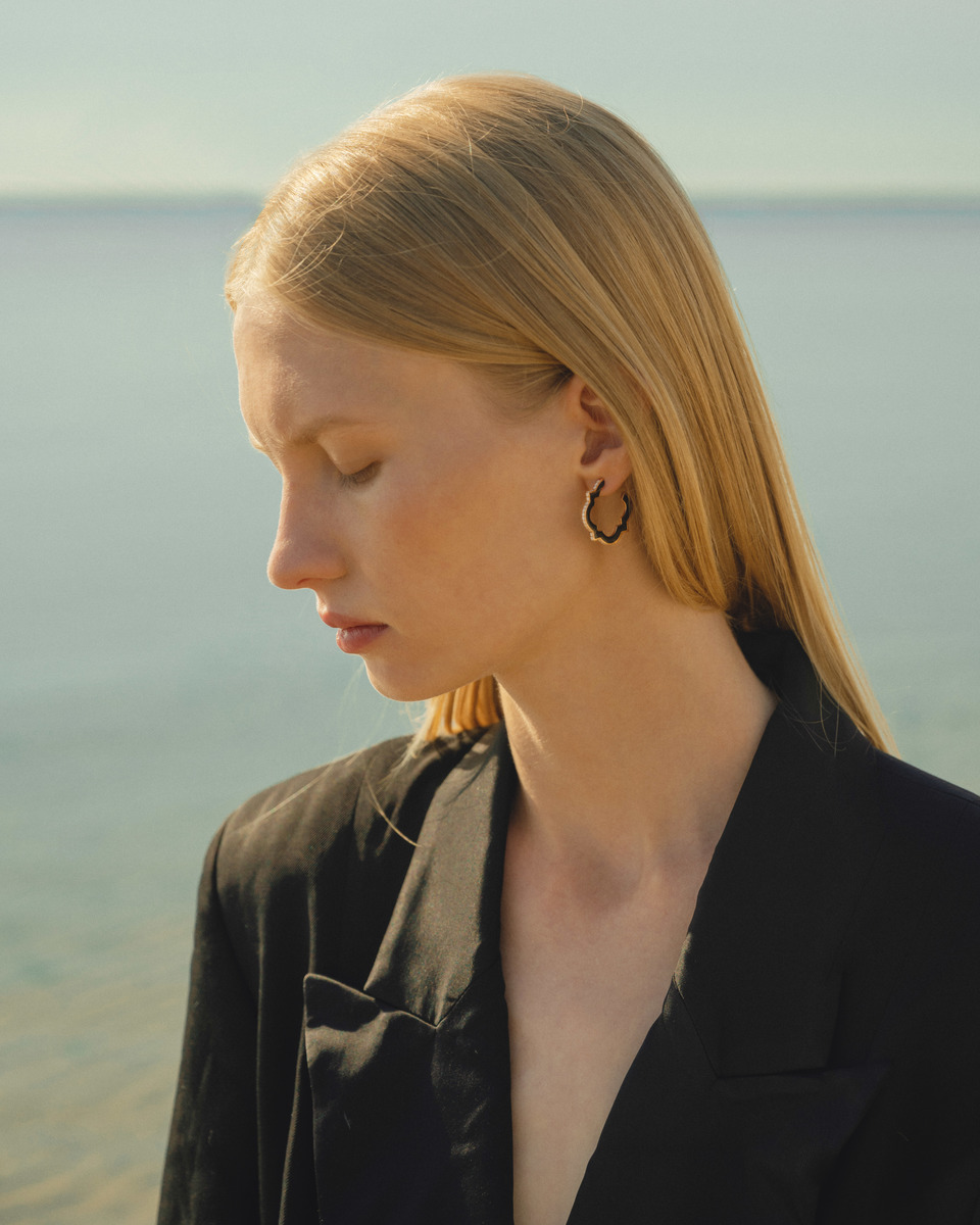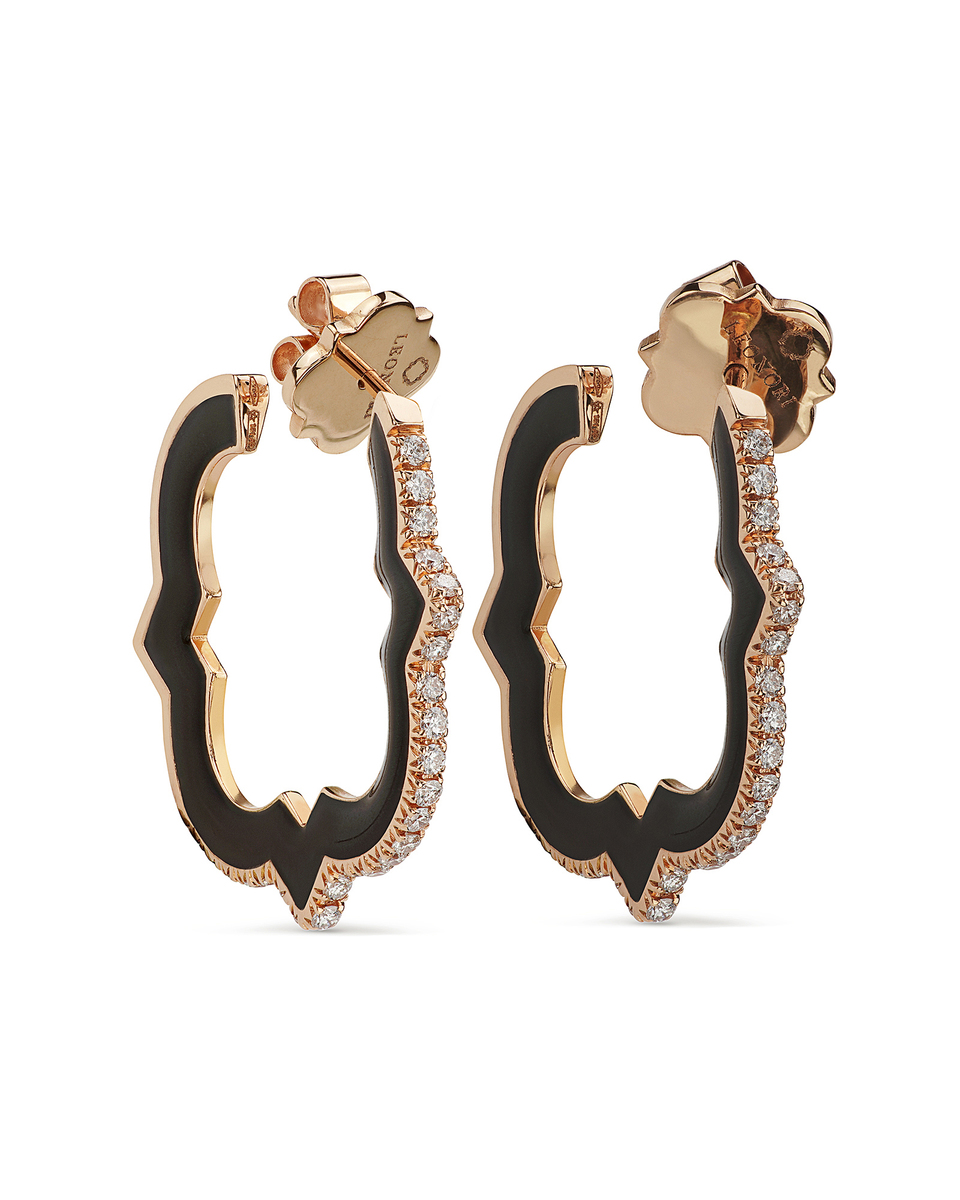 Leonori rinnova il fascino degli orecchini a cerchio, qui nella versione media, rivestendoli di preziosa smaltatura nera e diamanti. Un design caratterizzato da un'estetica audace e inaspettata che combina materiali, colori e linee essenziali.